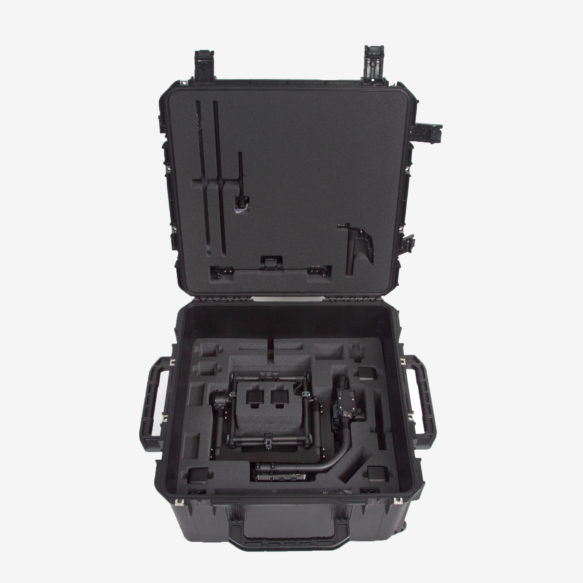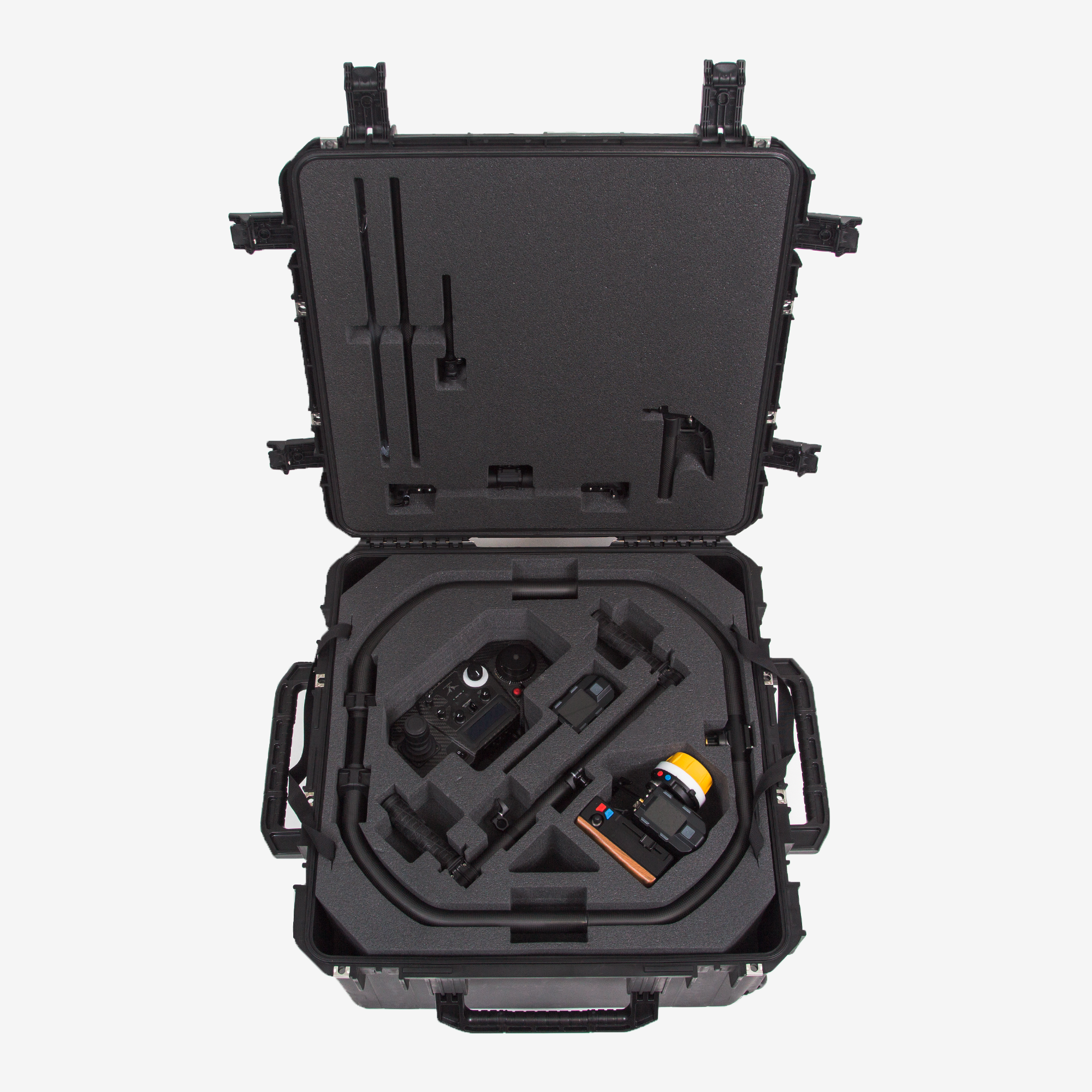 Pořádek a rychlý přístup jsou zásadní pro štáb na lokacích: vícevrstvý pěnový vložek s popruhy dovoluje organizovat tělo gimbalu, různé držáky, baterie, ovladače, kabely a drobné příslušenství tak, aby bylo vše po ruce při rychlých přesunech mezi záběry.