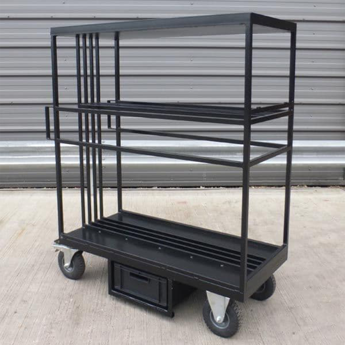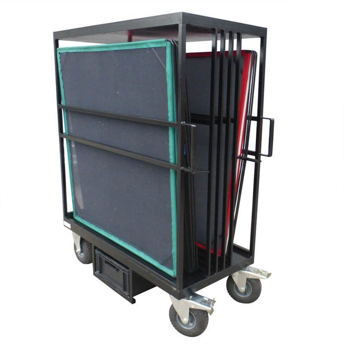 Lomart Mini Flag Cart je navržen tak, aby eliminoval chaos při manipulaci s flags a gripem. Na menších lokacích, studiích nebo při rychlých přestavbách scény poskytuje centrální bod pro všechny zásahy do světla. Gripové týmy ocení možnost mít přehledně uložené zásoby diffusorů, černých flagnů, cookie materiálů a rámů, zatímco režie a DIT mohou snadno požádat o konkrétní kus bez prodlevy. Díky euro crateu je drobné příslušenství vždy po ruce — od gaffer pásky po rychlé spojovací prvky. Hladký pohyb vozíku umožňuje rychlé přesuny mezi exteriéry a interiéry a kompaktní profil zaručuje kompatibilitu s výtahy a dopravou.