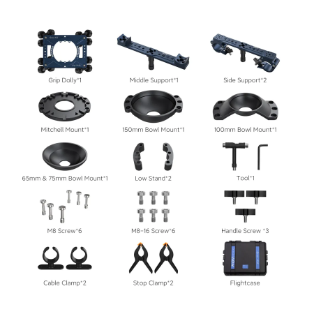 Movmax Grip Dolly Pro Kit With Flightcase je profesionální řešení pro plynulé a bezpečné pohyby kamery v náročných filmových a broadcast produkcích. Tento kompletní kit kombinuje robustní konstrukci, precizní mechaniku a ochranný transportní flightcase, což umožňuje kameramanům, grip týmům a produkčním společnostem rychlou nasaditelnost na place i spolehlivou opakovatelnost záběrů. Díky modulárnímu designu a odolným komponentům je Movmax Grip Dolly Pro Kit ideální pro studiové i lokální natáčení, kde je požadován profesionální tracking a stabilita při pohybu kamer až do vyšších hmotností.