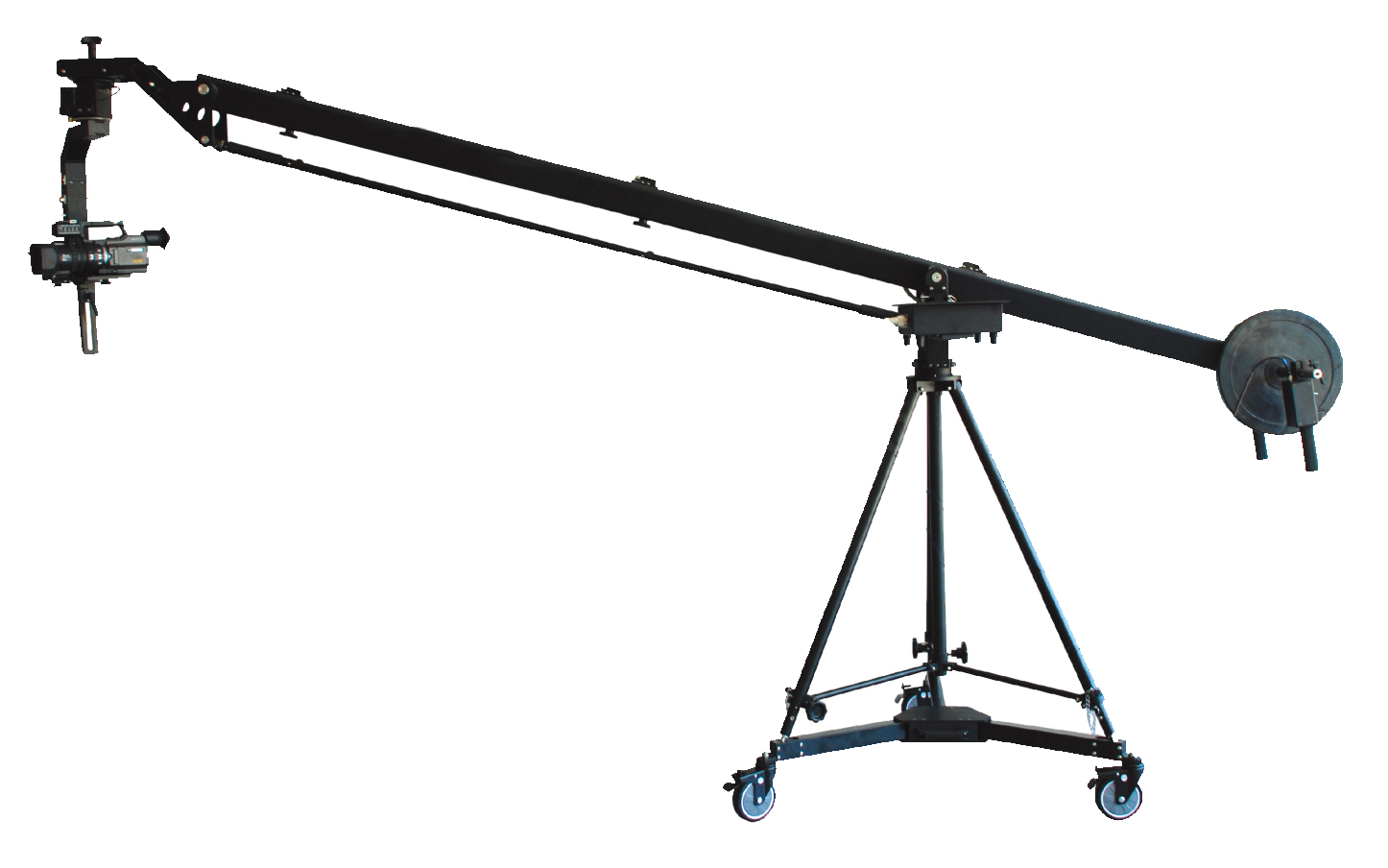Contrast to normal tripod system, Mini Traveler provides more range of motion. Since it adopts rear remote operation, it helps operators complete some sequence which front-operated jib cannot accomplish. For instance, booming jib and shot from very high point which ordinary people hardly reach. Moreover, due to restriction of terrain and other factors, camera men are not able to do front-operation, such as no terrain underneath the front of jib, but the remote control from rear of Mini Traveler gives an outstanding solution to this circumstance.