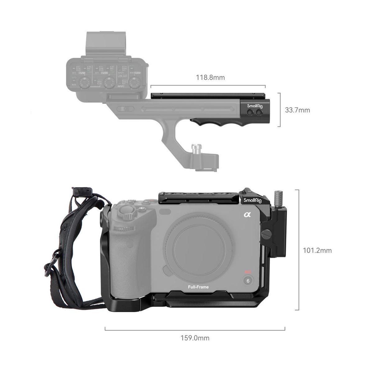 – Obsah balení (standardní konfigurace): částečná klec, top handle s XLR rozšířením, HDMI clamp, dvě NATO lišty, hand strap, montážní šrouby (včetně 3×1/4-20).